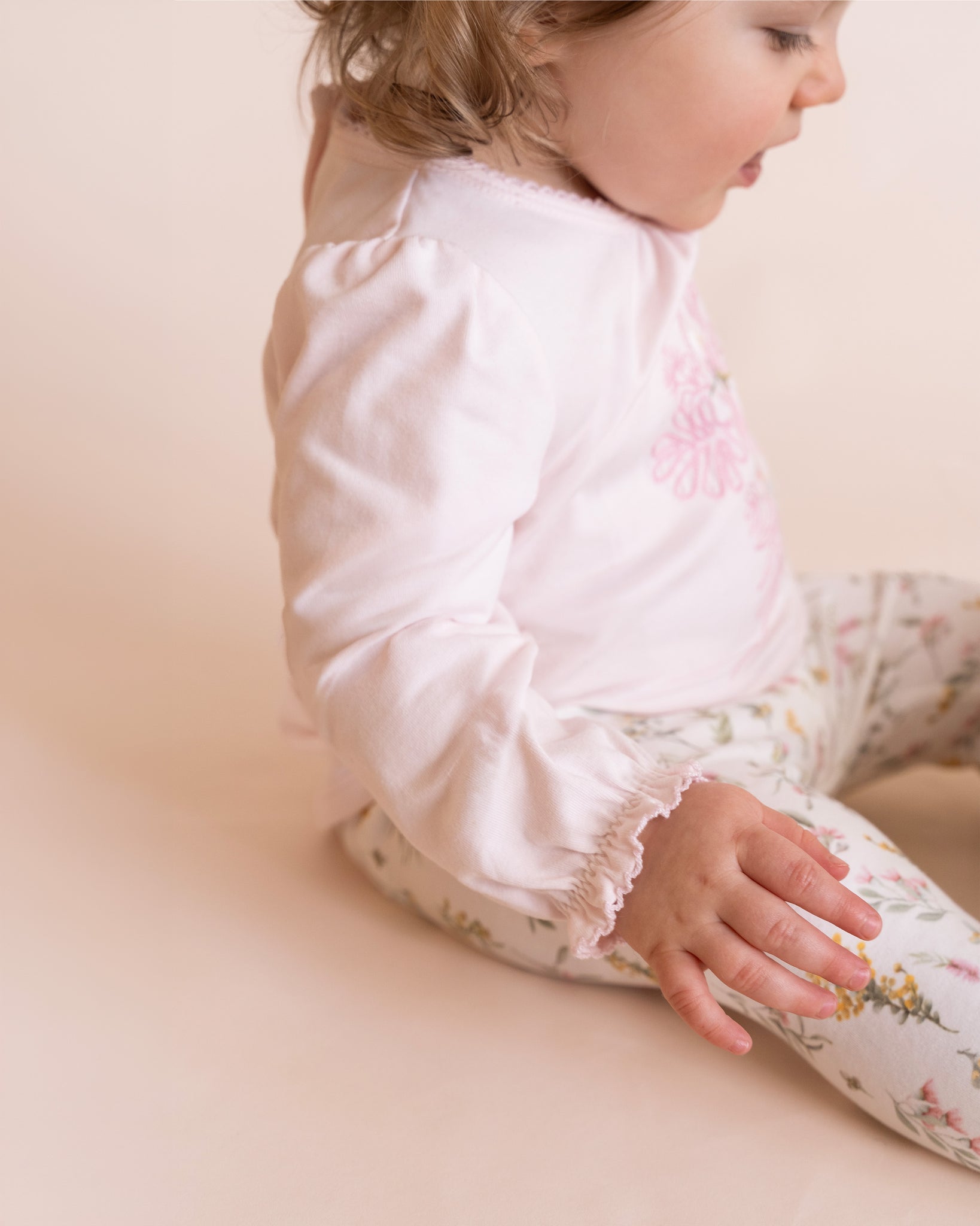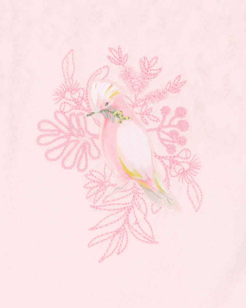 A sweet everyday organic blend tee with a soft gathered neckline and gently puffed sleeves, finished with elasticated frill cuffs for a pretty touch. The embroidered cockatoo graphic surrounded by floral detailing in a gentle blush palette adds a little Australiana charm to this comfy staple. Perfect for layering with our Charlie wattle leggings, it’s an easy wardrobe staple for cooler days.