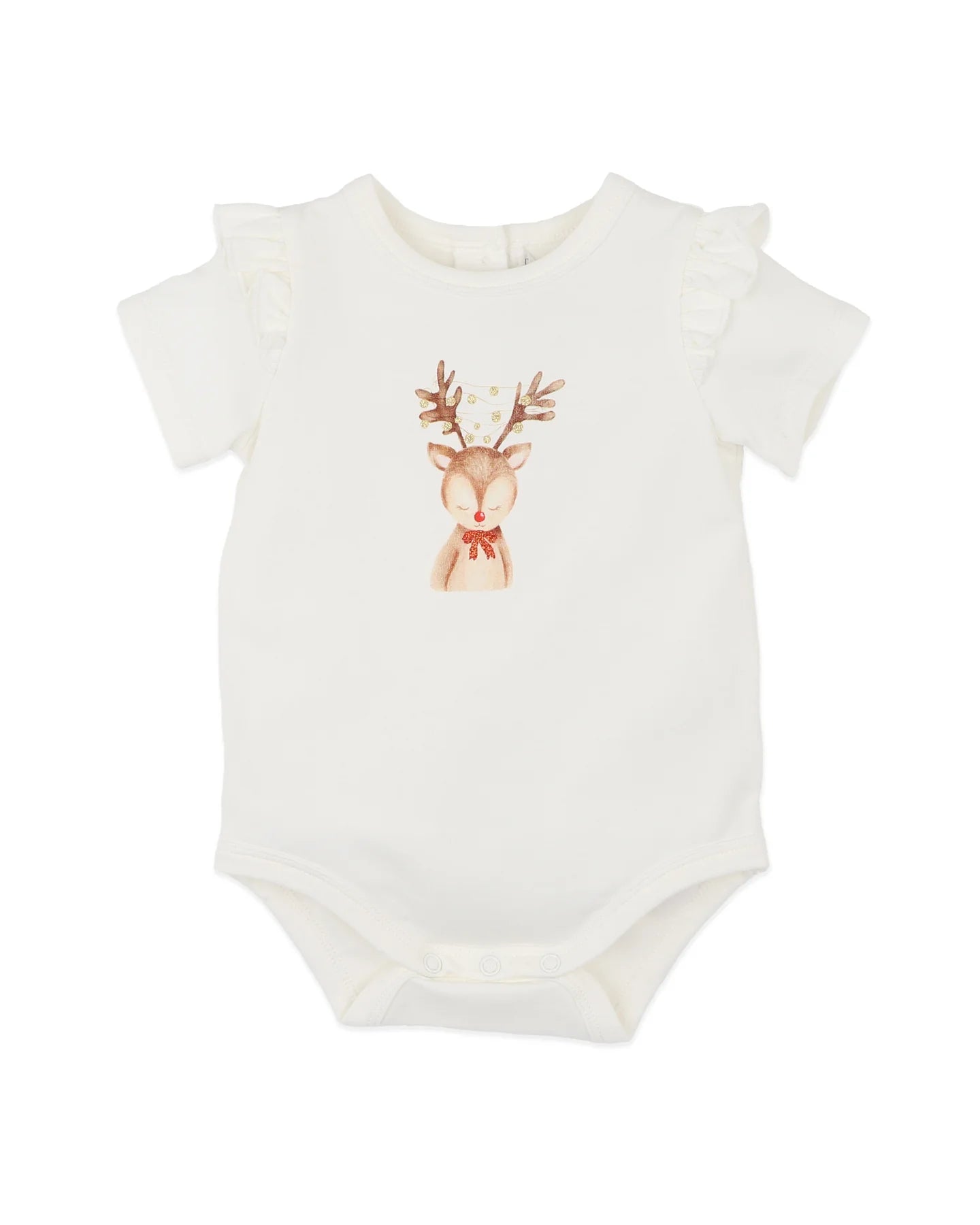 A sweet little reindeer moment for baby’s first Christmas! This two-piece set includes a soft ivory bodysuit with the sweetest reindeer print and festive frill sleeves, paired with red-and-white stripe bloomers for a cheery holiday look that’s as comfy as it is cute.