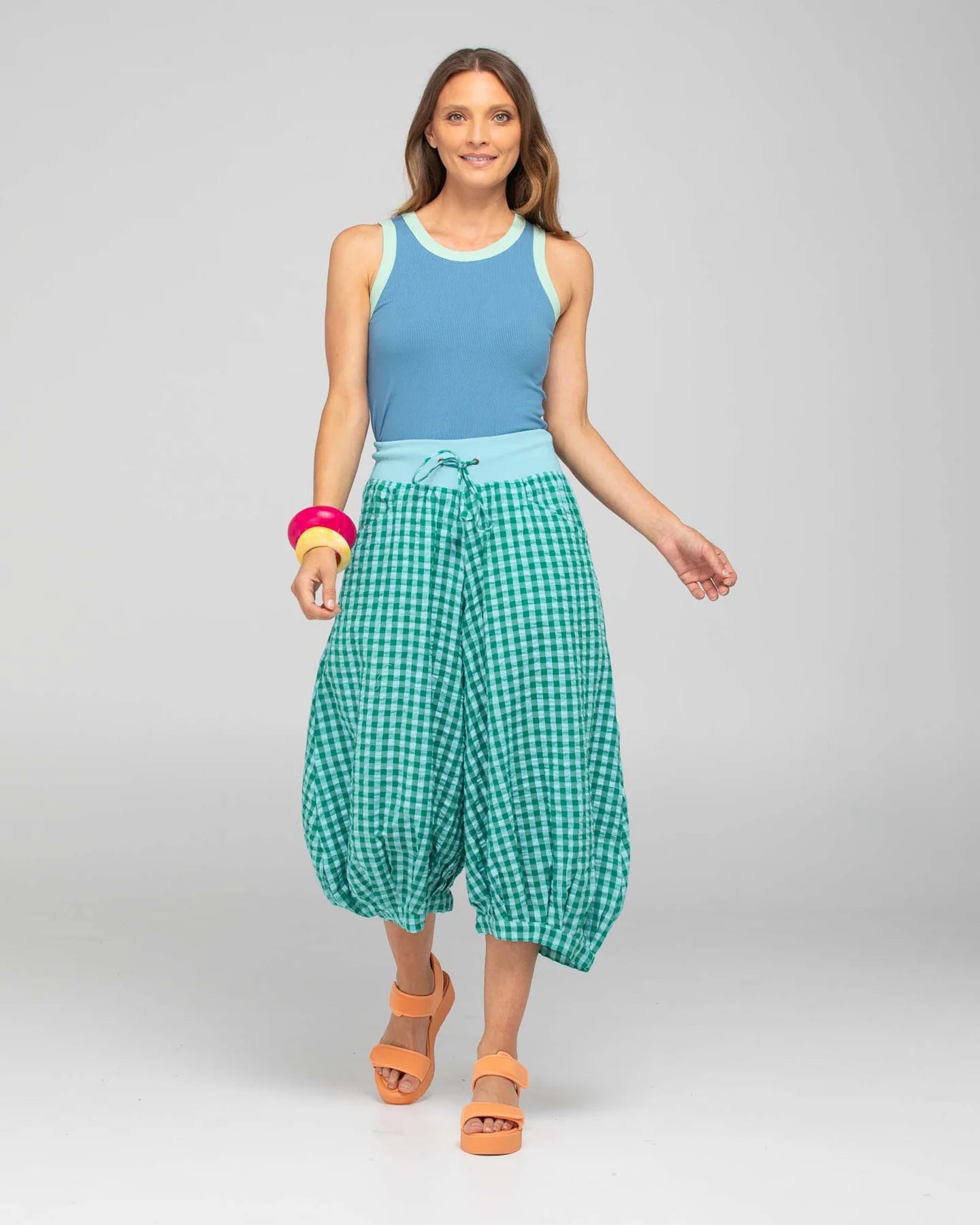 100% cotton, stretch cotton waistband with drawstring tie, two front and back pockets, 3/4 length.