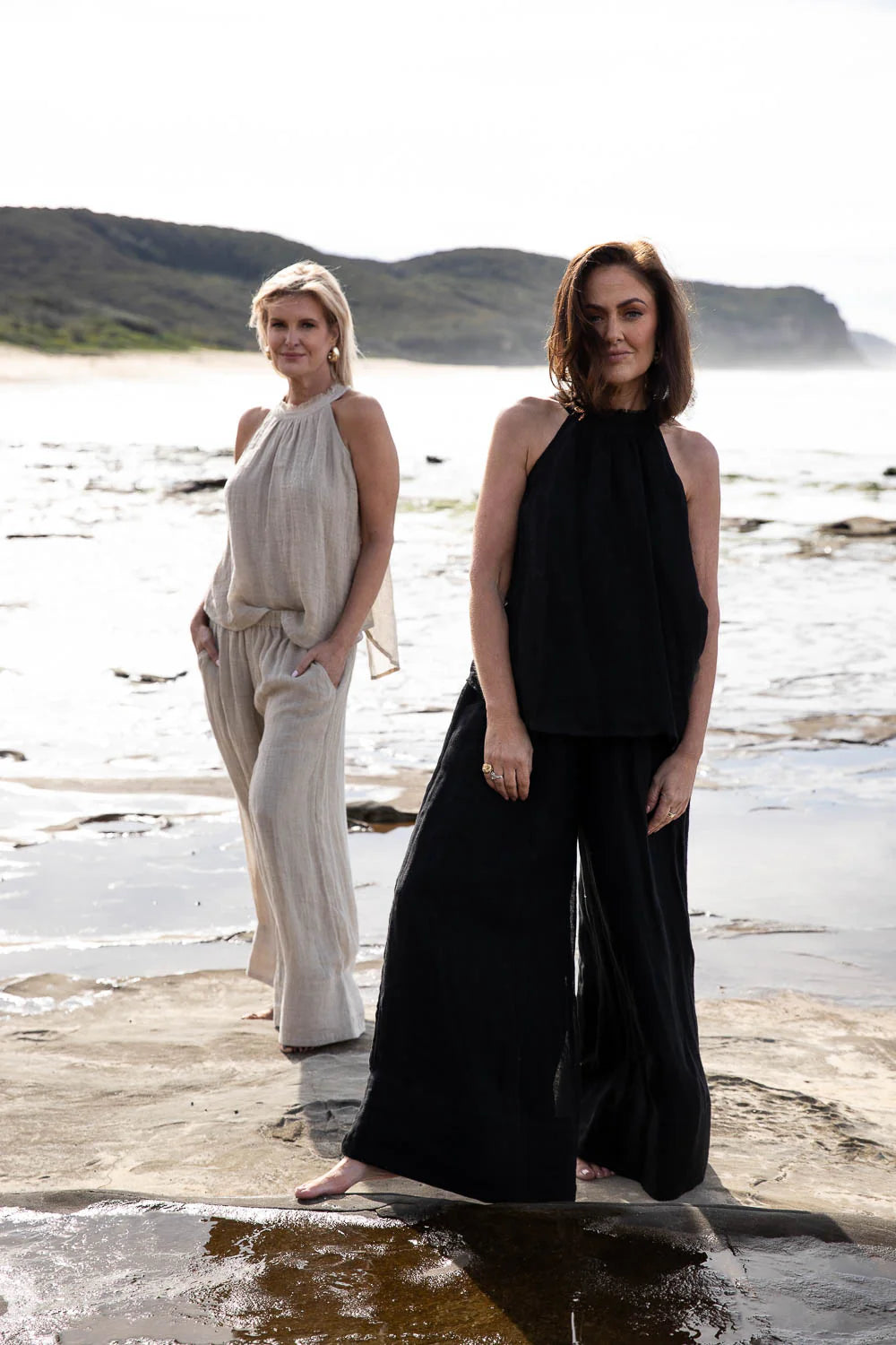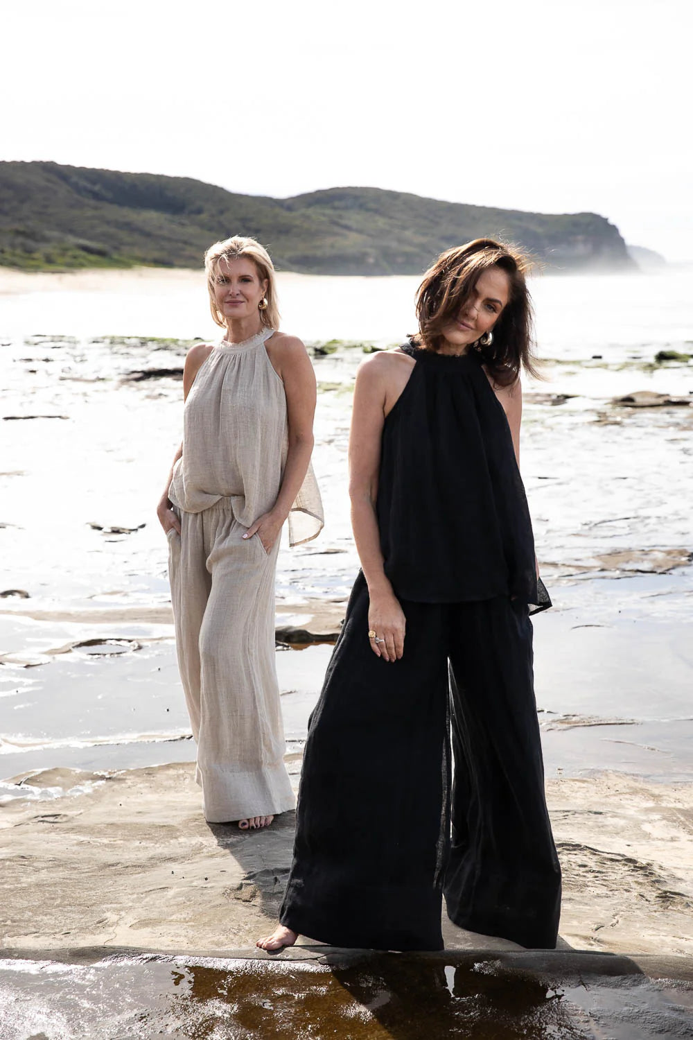 The Arana Linen Pant are a dream to wear. The pant leg is ultra-wide, lined with a soft cotton fabric and falls just below the ankle. Featuring an elasticised waist for comfort, these pants are designed to be worn as mid to low rise.