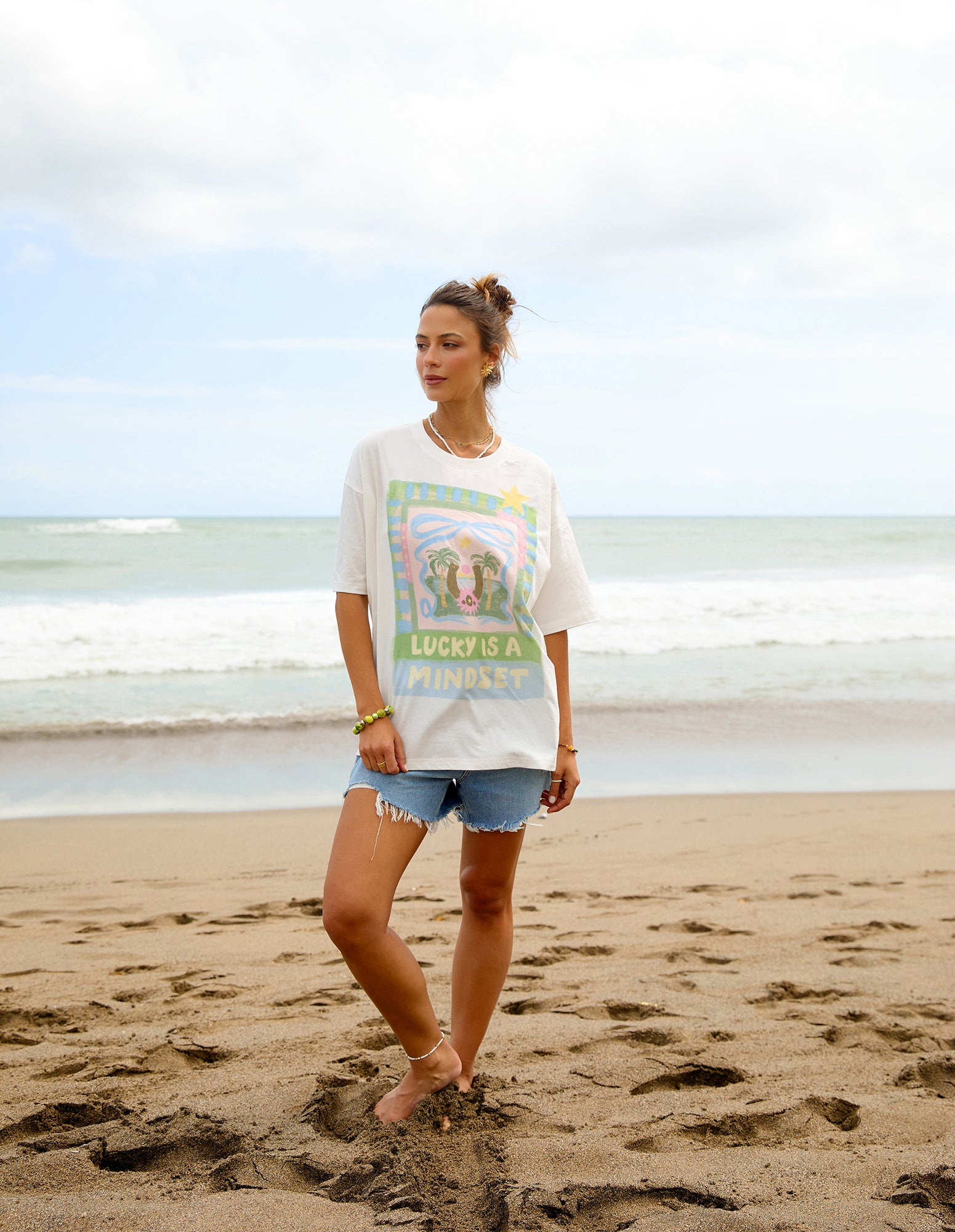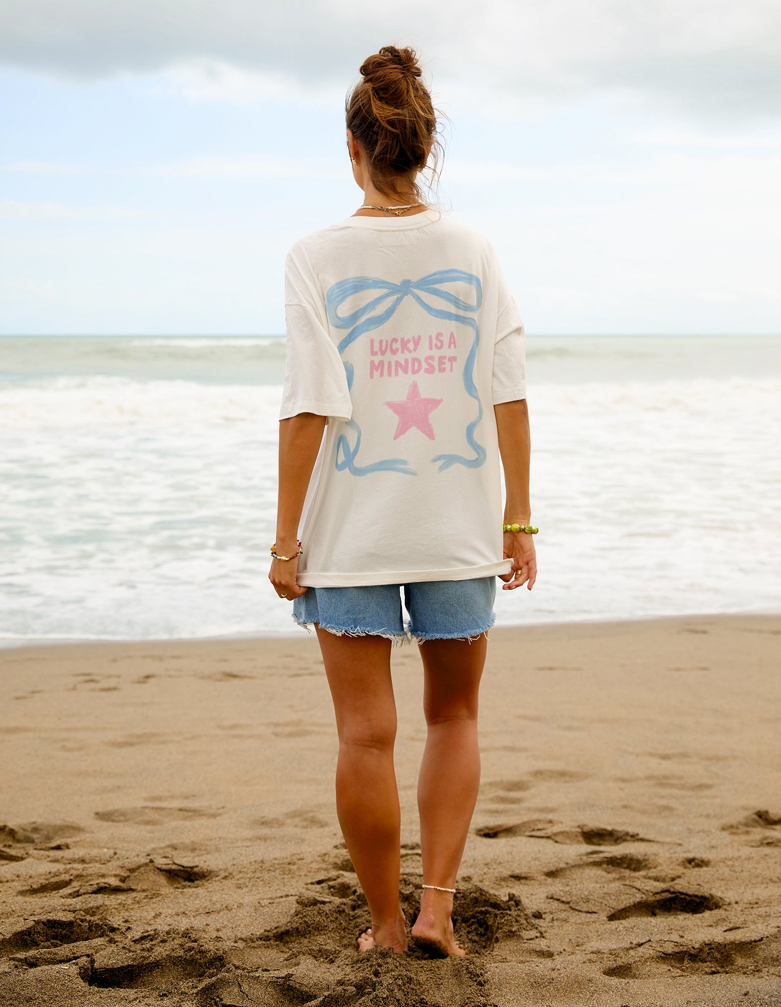 Lucky looks good on you. The Lucky Stars Tee brings that sun kissed, carefree energy with soft cotton, faded pastel vibes and hand painted artwork made for dreamers. It’s got that worn in feel, like it’s already lived a few beach days and late nights. A reminder that good energy is a choice and luck really is a mindset.