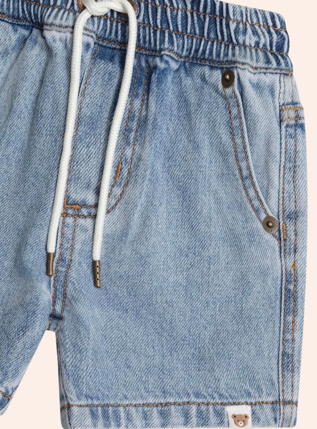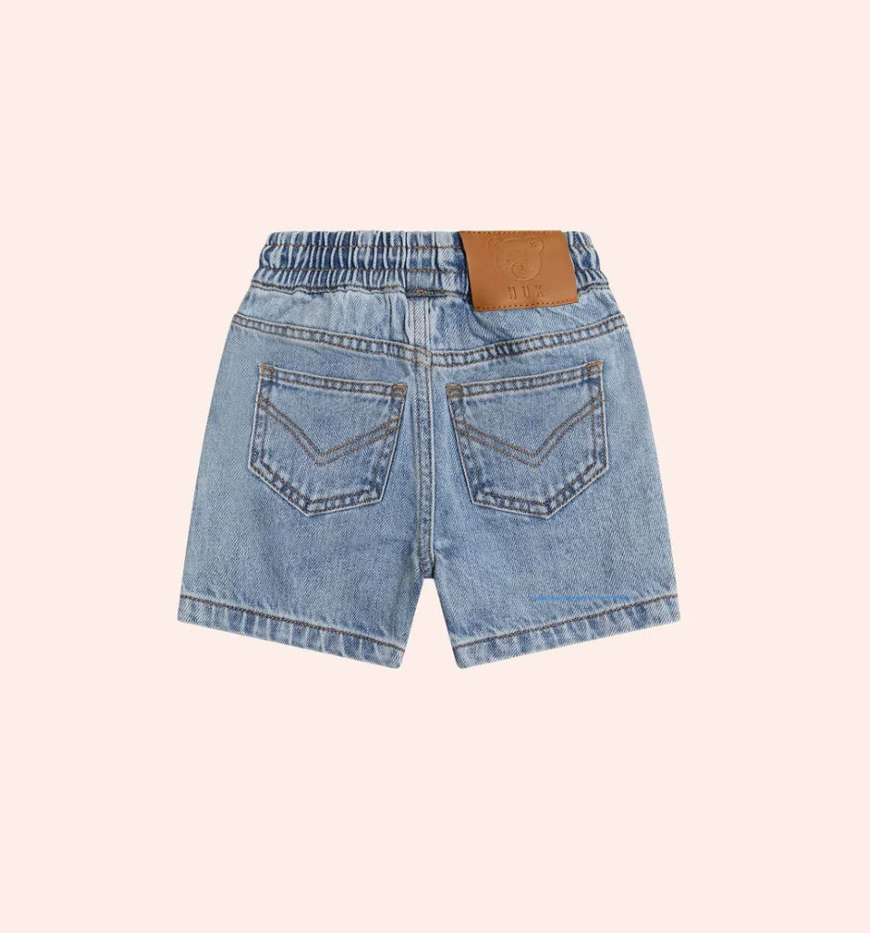 No other shorts compare. Made from the softest denim you'll ever feel, they feature a kid-friendly elasticated waistband and adjustable drawstring. Front and back pockets hide treasures perfectly, and an oversized, relaxed cut looks cool on every occasion. Spot the Huxbear patch on the bum as they run away to play.
