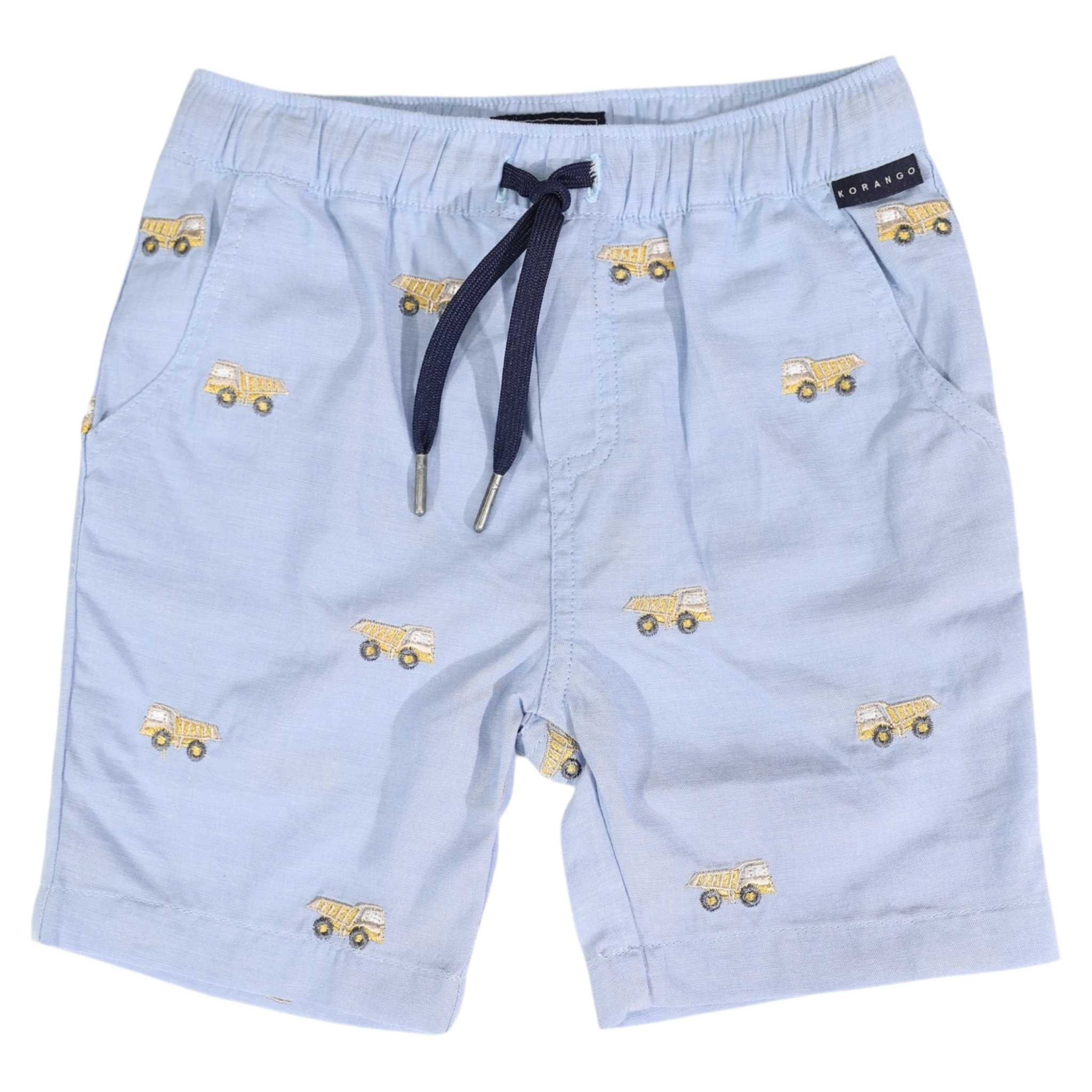 Get set for a day of adventure with the Korango Boys Embroidered Truck Chambray Shorts! Made from super-soft light chambray fabric, these shorts are as comfy as they are cool. The elasticated waist and drawstring give him the perfect fit for non-stop play, while handy pockets are ideal for stashing treasures. Featuring fun embroidered yellow trucks, these durable shorts are perfect for your little explorer who’s always on the move. Easy to wear and full of fun.