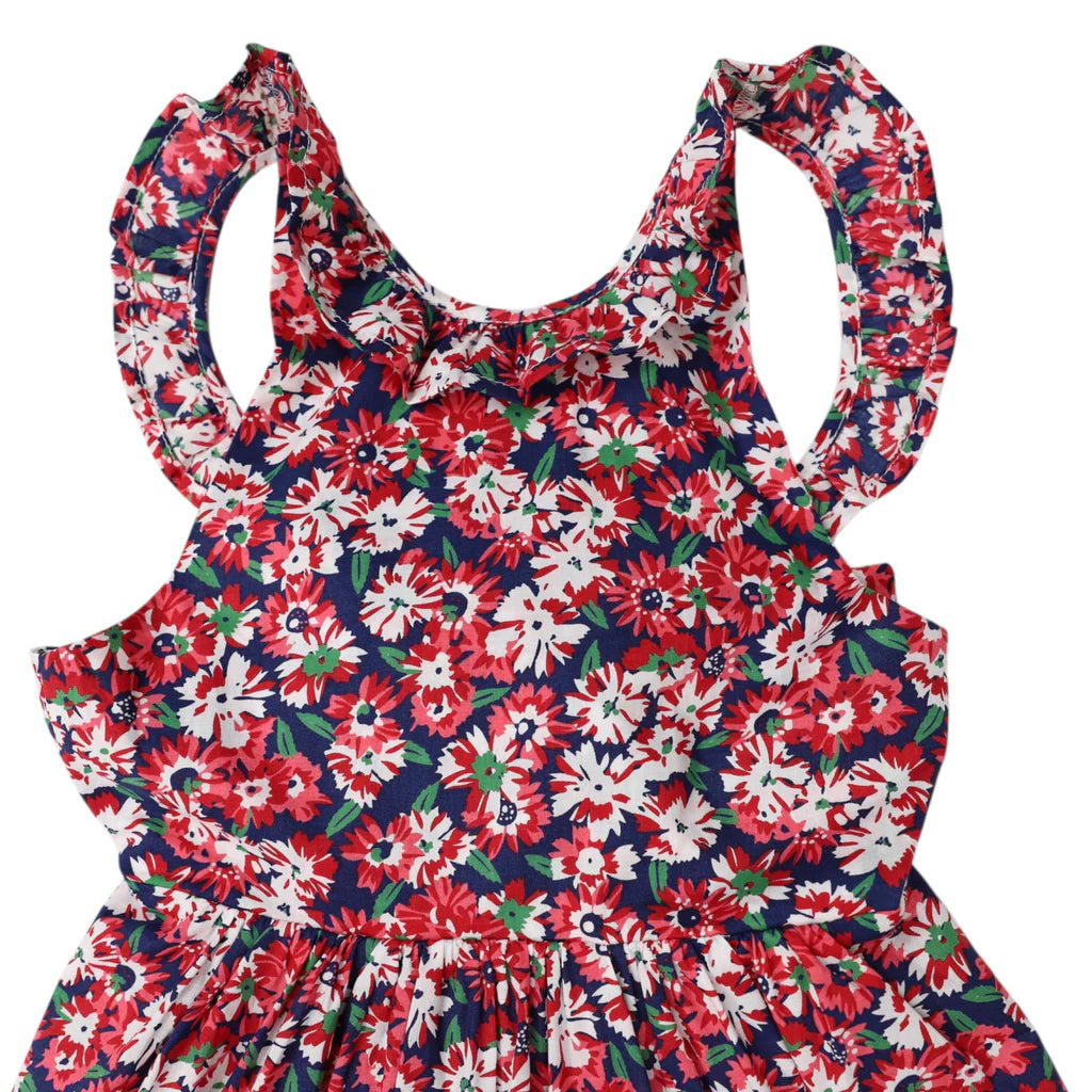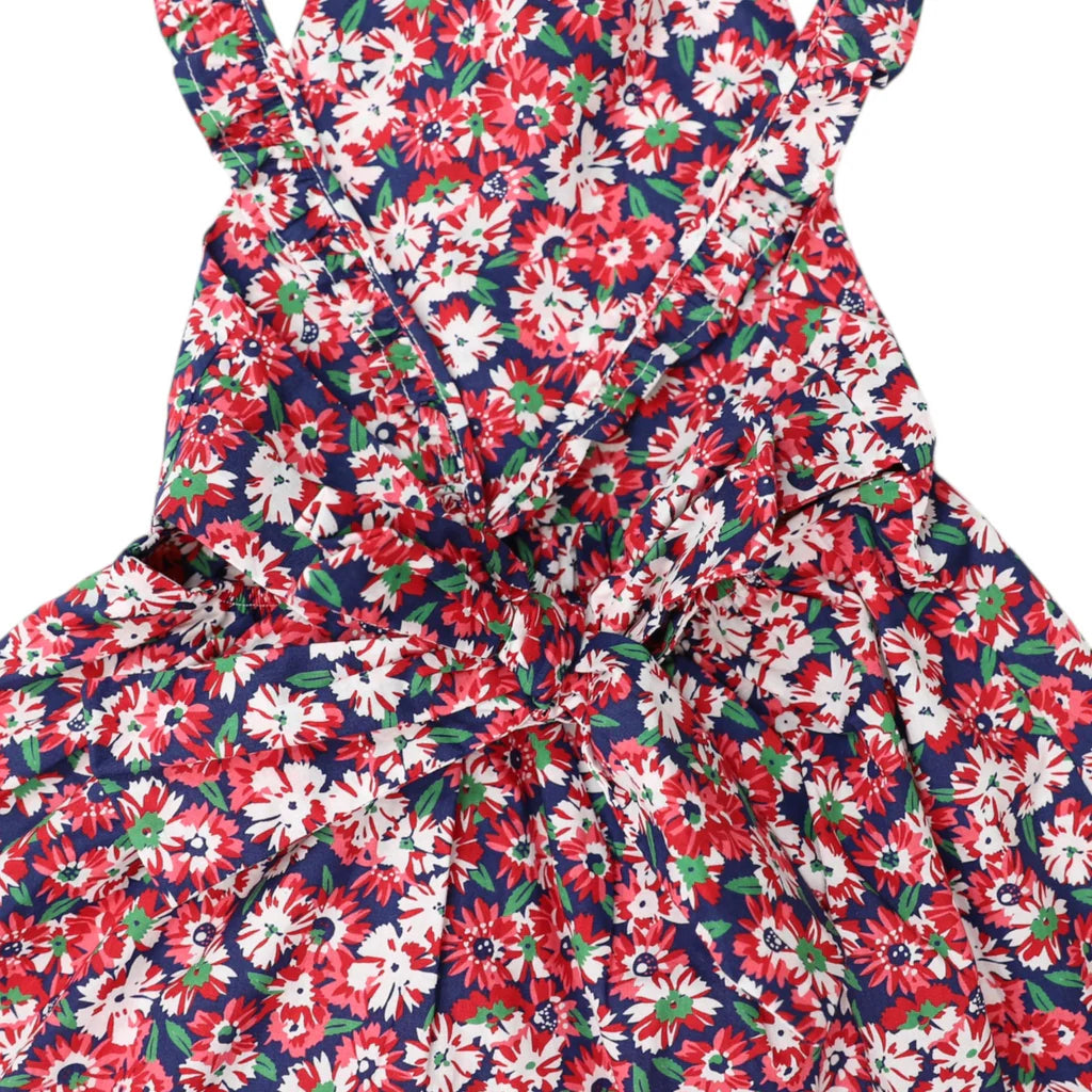 Transform your little one's wardrobe with Korango's enchanting Floral Dress Red. Picture her twirling in the garden, the flowy red, white, and green floral print dancing against a deep navy background. The frilled neckline and shoulder straps add a touch of whimsy, while the open back and tied bow create an elegant silhouette. Perfect for playdates or family gatherings, this fully lined dress ensures all-day comfort. Watch as she blossoms with confidence and joy in every step. Make memories that last with a dress she'll adore.
