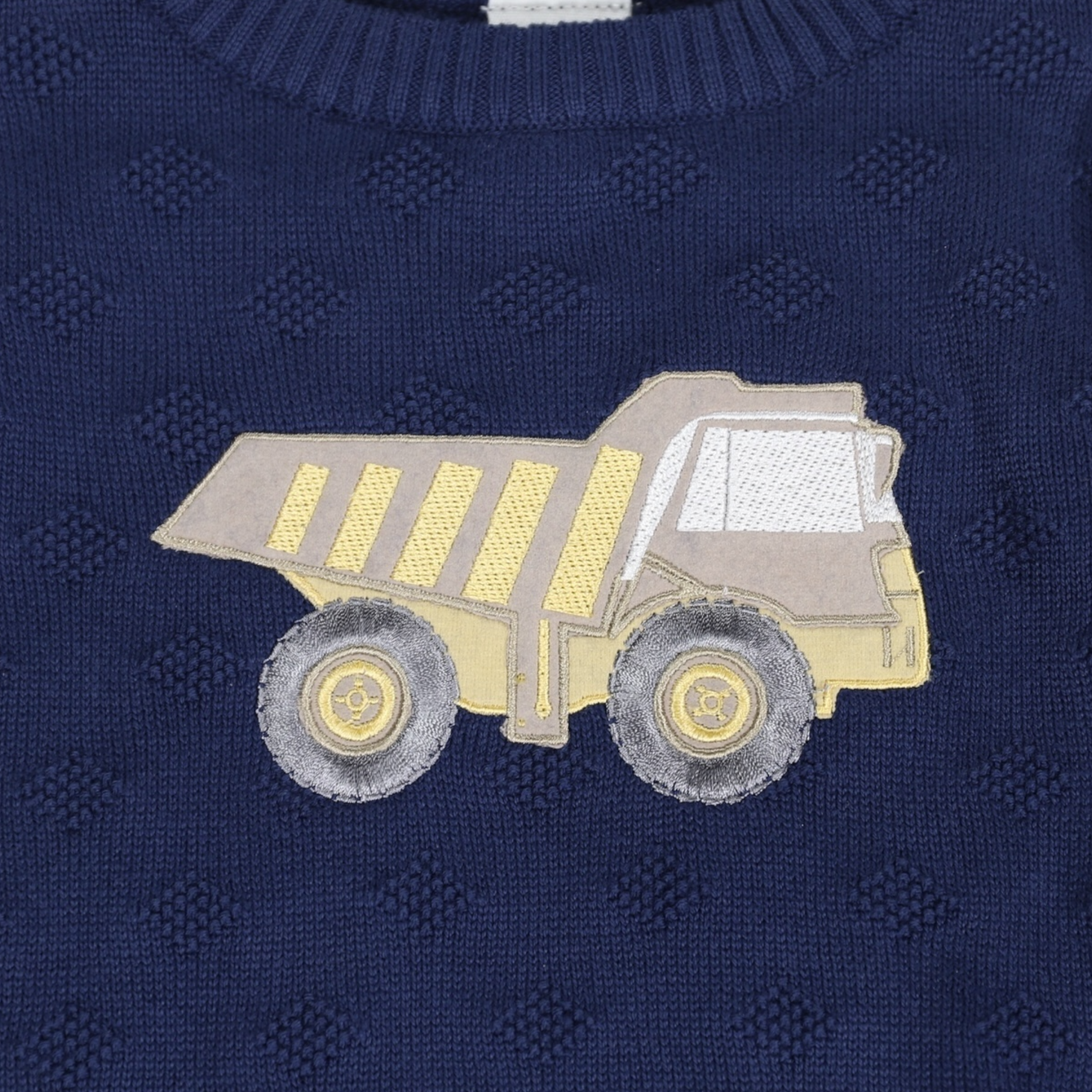 Keep your little one cozy and stylish with the Korango Truck Applique Knit Sweater! This navy sweater, featuring a fun yellow dump truck design, is perfect for chilly days and endless adventures. Made for comfort and full of personality, it’s a wardrobe essential for your mini construction fan.