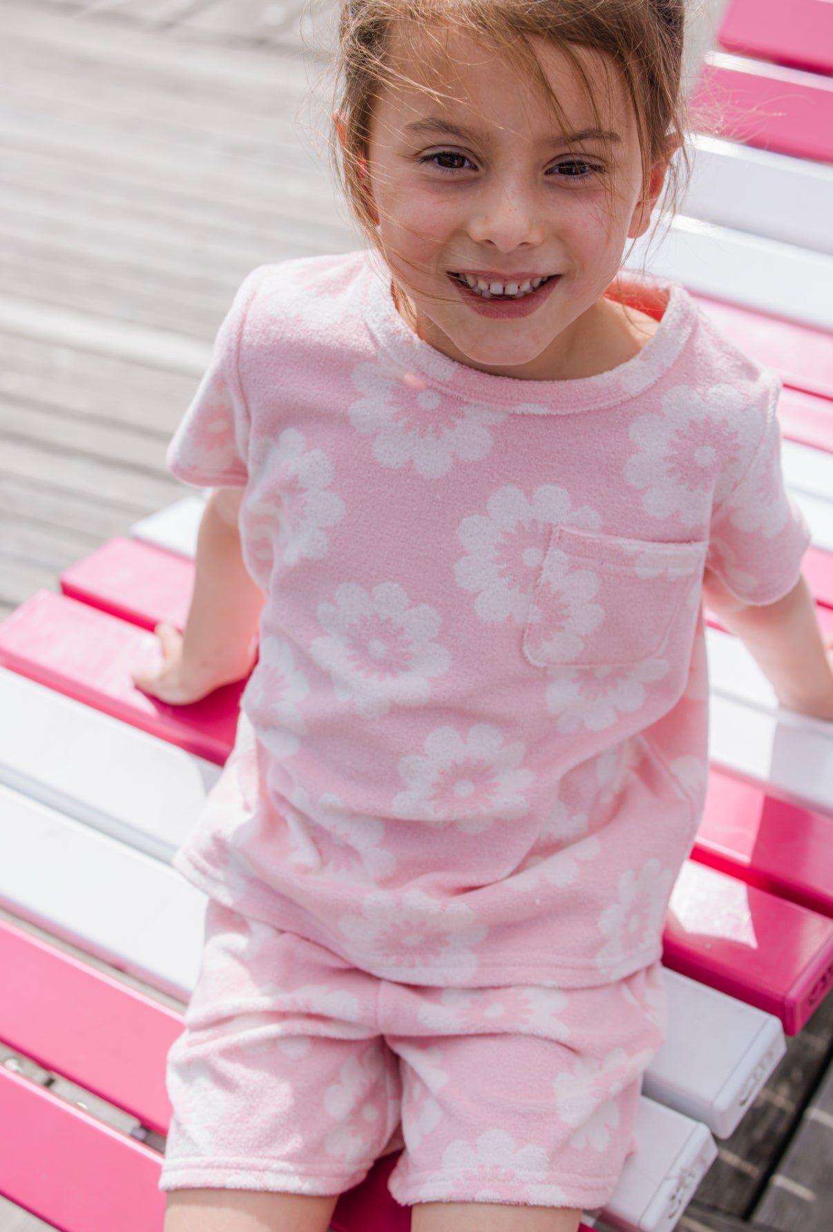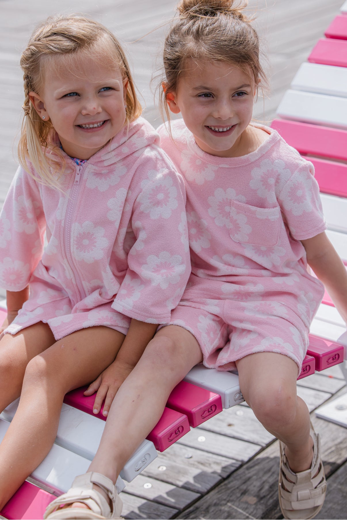 Milky Clothing Floral Terry Towelling Set is the ultimate post-swim outfit for sunny summer days. Featuring a soft pink base with off-white flower print, this lightweight set is made from classic terry towelling fabric that helps wick away water to keep your little one comfy and dry. Wear it as a matching set or mix and match with other favourite pieces, it’s perfect for poolside lounging, beach play, or casual weekend fun.