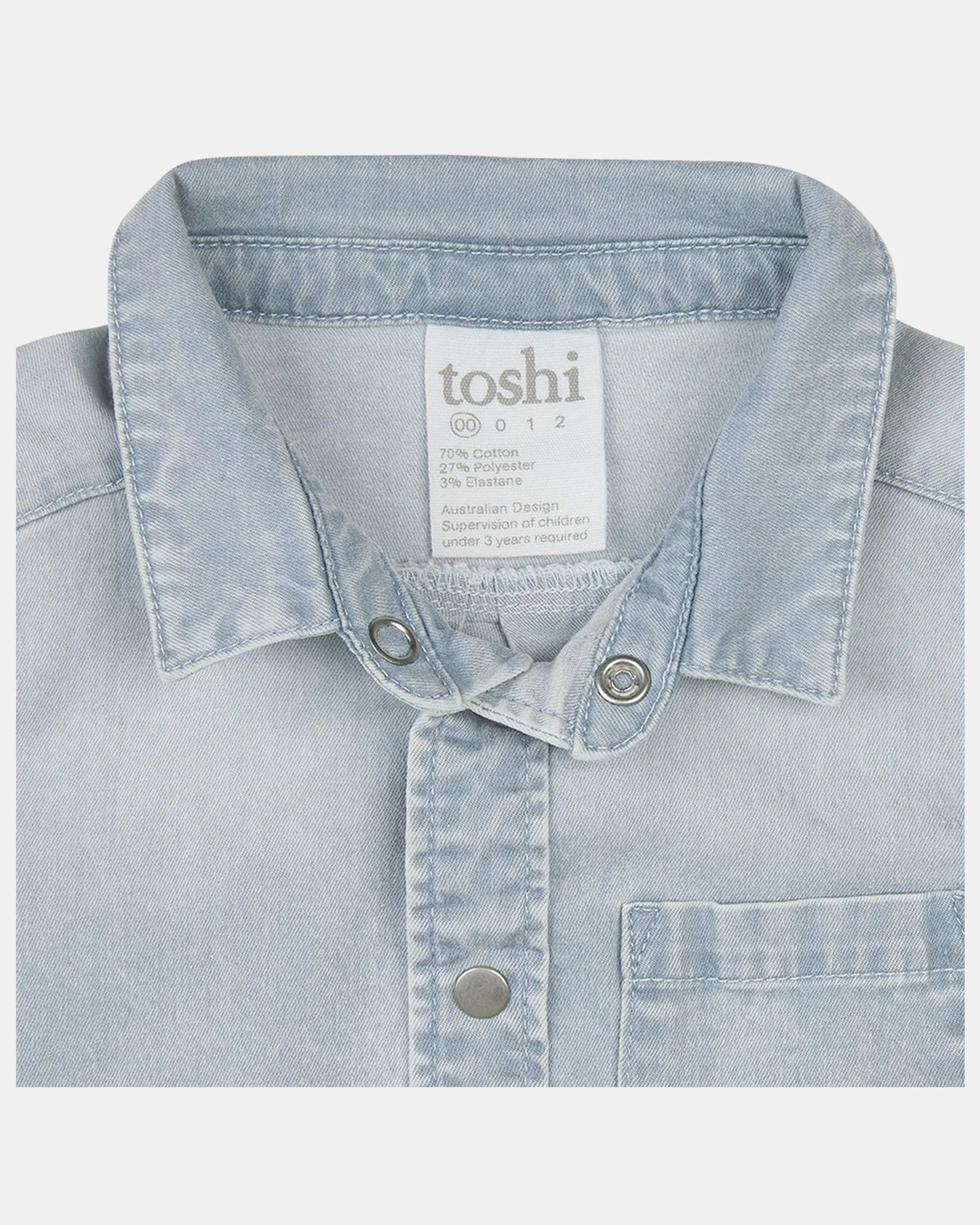 Toshi Shirt Classic Indiana is crafted from the finest quality cotton, artisan washed, distressed denim. The short sleeves and collar create a relaxed and casual styling. Subtly Toshi branded, front opening press studs for ease of dressing. A functioning pocket is included for practicality. Toshi Shirt Classic Indiana is a versatile wardrobe essential and transitions effortlessly from play dates to special occasions.